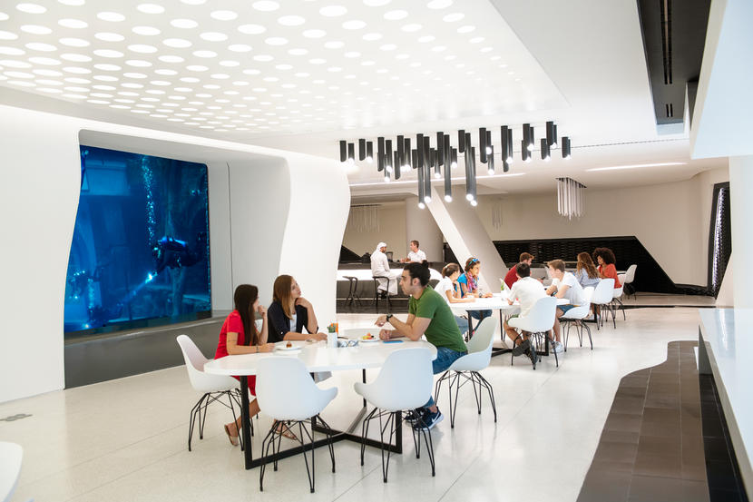 As áreas de observação nos andares inferiores do edifício permitem que os visitantes possam jantar no restaurante acenem para os mergulhadores.