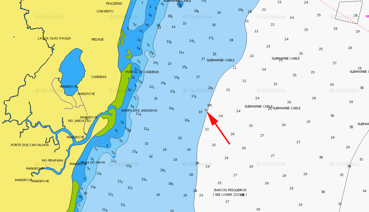 - A draga afundou em frente à Praia de Boa Viagem e distante 15 milhas do porto de Recife. Contudo, a Praia de Boa Viagem termina muito antes, e essa distância seria equivalente ao município de Candeias-PE.
