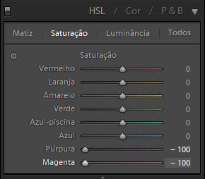 Nessa parte, mais precisamente na pasta “Saturação”, normalmente reduzo o grau de incidência da cor para zero nos itens Púrpura e Magenta, as cores mais próximas do roxo,. Isso fará com que o efeito arroxeado nas bordas acabe sumindo.