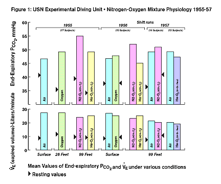 A partir do trabalho contínuo, ficou claro que, ao respirar misturas de nitrogênio e oxigênio em profundidade, ocorria retenção de dióxido de carbono, enquanto que com hélio e oxigênio, a ventilação permanecia essencialmente intacta e os níveis de CO2 permaneciam próximos do normal. As conclusões alcançadas após os estudos de 1956 e 1957 (4) incluíram o seguinte: