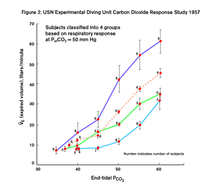 Lanphier e Dwyer verificaram experimentalmente que alguns mergulhadores EDU respiravam menos do que outros durante trabalhos equivalentes. Eles coletaram amostras de gás expirado (o último gás expirado em uma expiração normal, idealmente consistindo apenas de gás alveolar) para uma estimativa dos níveis de CO2 no sangue arterial. Em profundidade, o CO2 expirado foi definitivamente elevado em certos indivíduos, particularmente quando foram utilizadas misturas de N2-O2 (2).