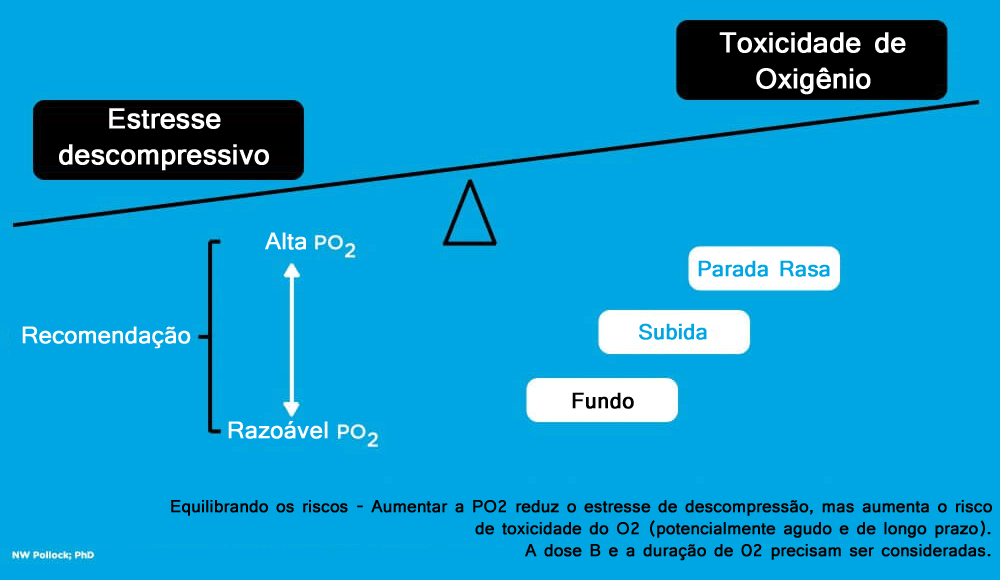 Alta PO² oferece benefícios e riscos para os mergulhadores. Uma redução no estresse descompressivo deve ser equilibrada contra um risco aumentado de toxicidade de oxigênio. A mudança na prática levou a alguma diminuição nas normas de PO², mas são necessárias mais pesquisas para entender melhor as variáveis ​​que afetam a suscetibilidade à toxicidade do oxigênio e a gravidade dos resultados. Informações adicionais quase certamente exigirão um aprimoramento adicional das diretrizes e práticas.