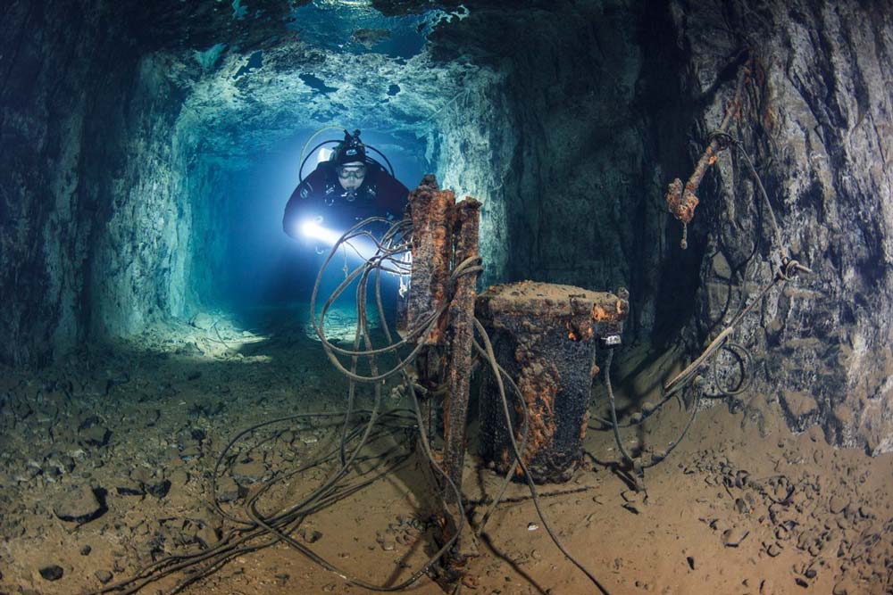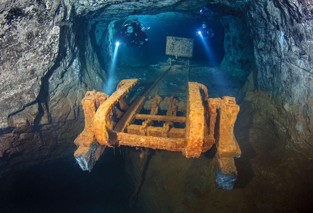 A impressão é de se estar dentro de uma cápsula do tempo: faltam apenas os trabalhadores para que mina volte a produzir chumbo. Praticamente sem esforço, você passará entre as gigantescas colunas e verá antigos carrinhos de minério, trilhos e ferramentas de diversas épocas. Mas alguns pontos são especiais. A antiga perfuratriz presa a uma parede de rocha é uma parada inevitável para os fotógrafos e poucos resistem à pose de “mineiro submarino”; o poço do elevador na trilha quatro é impressionantemente grande e faz com que os mergulhadores pareçam insetos em volta dele.