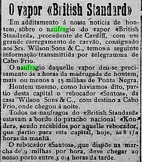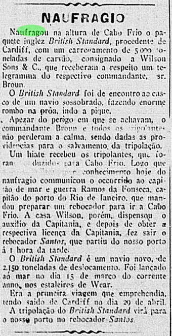 Notas: O navio vinha de Cardiff – Reino Unido