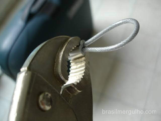 - Faça o mesmo na outra extremidade, porém, coloque o cadeado, para que você consiga a medida precisa do cabo contornando a bagagem e regulando para mais ou menos, o posicionamento do prensa cabos a ser fixado.