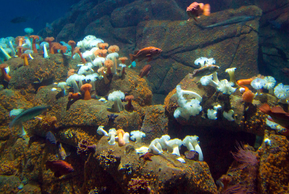 Conforme descemos, vejo algumas algas suspensas nas águas azuis claras com caranguejos vermelhos brilhantes e caracóis agarrados às folhas. O recife rochoso é coberto com grandes anêmonas, parecendo um campo de flores coloridas. Nesse meio tempo, uma foca morde minha nadadeira e se afasta rapidamente, depois, surge uma grande arraia que passa por nós lentamente. Sendo uma reserva marinha há tempos, então os peixes são abundantes e grandes.