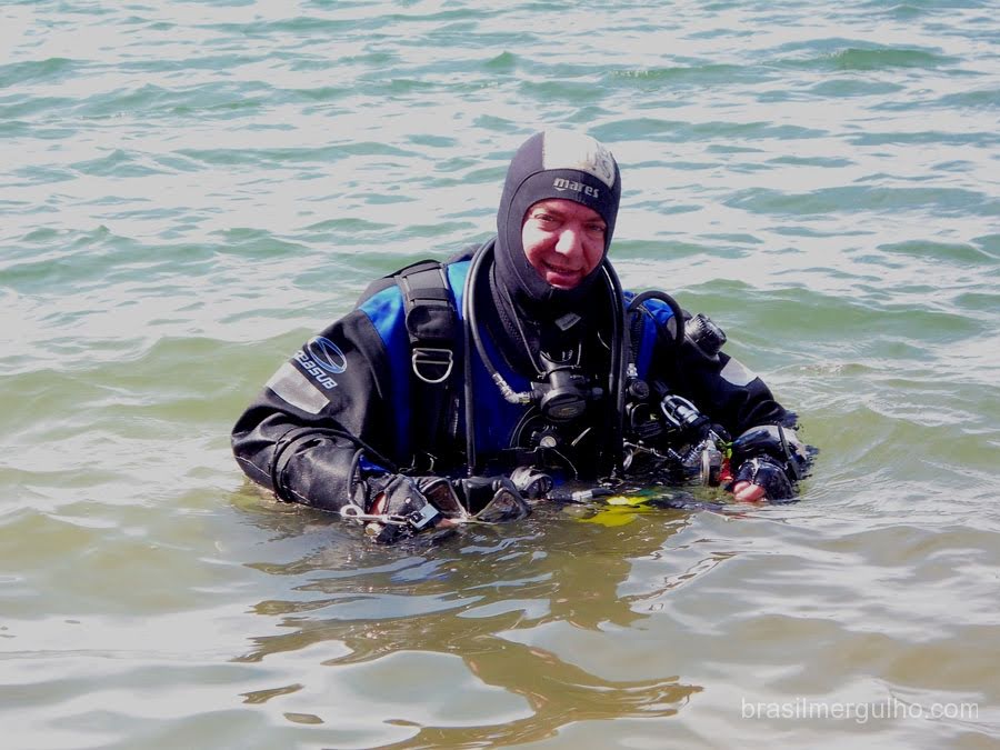 Após chegarmos ao local, com uma visita a pé nas proximidades, para conhecer o percurso até a beira do rio, tendo em vista que nunca mergulhei neste local (tivemos que descer alguns degraus, o que seria complicado e desajeitado, com uma dupla de aço, mesmo que nas costas, dado o ângulo de descida e a precariedade do local). Uma vez conhecido o percurso, entramos na água.