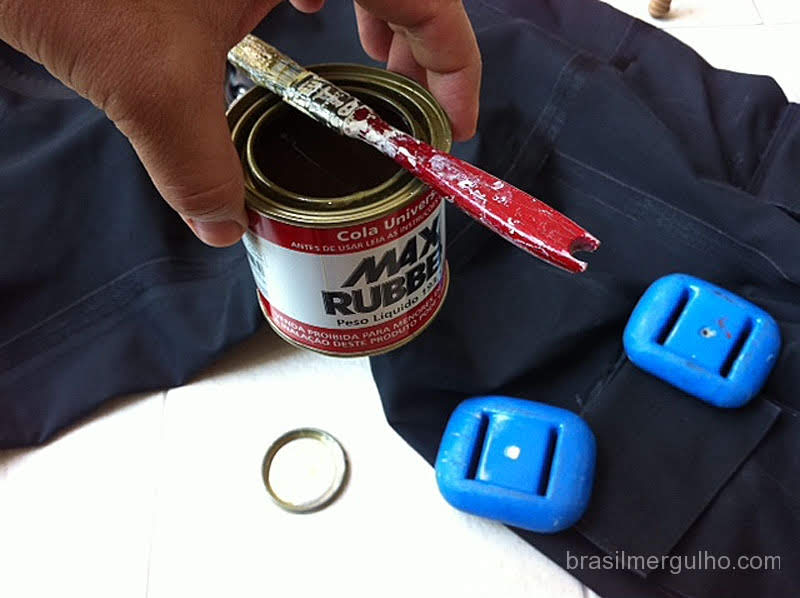 5) Depois que passar a cola, não encaixe o bolso. Aguarde até 10 minutos, para que o excesso do solvente evapore.