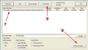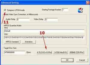 8 – Clique em Advanced Setting, a única opção que você deverá mexer aqui é no tamanho da mídia que você irá usar (n° 10), se DVD, miniDVD ou CD. Verifique se Compress LPCM Audio (n°11) está marcado. Não altere mais nenhuma opção;