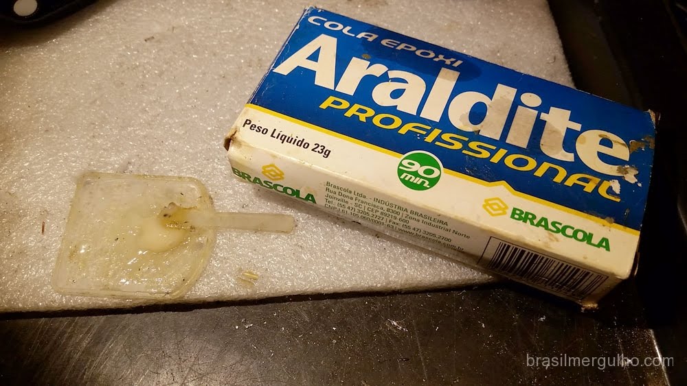Para cada tipo de produto usado embaixo d´água, utiliza-se uma cola específica para o caso, e como estamos falando de um material plástico em conjunto com o inox e água salgada, a princípio, a melhor opção é usar a cola Araldite Profissional, que possui grande firmeza e é resistente à água salgada.