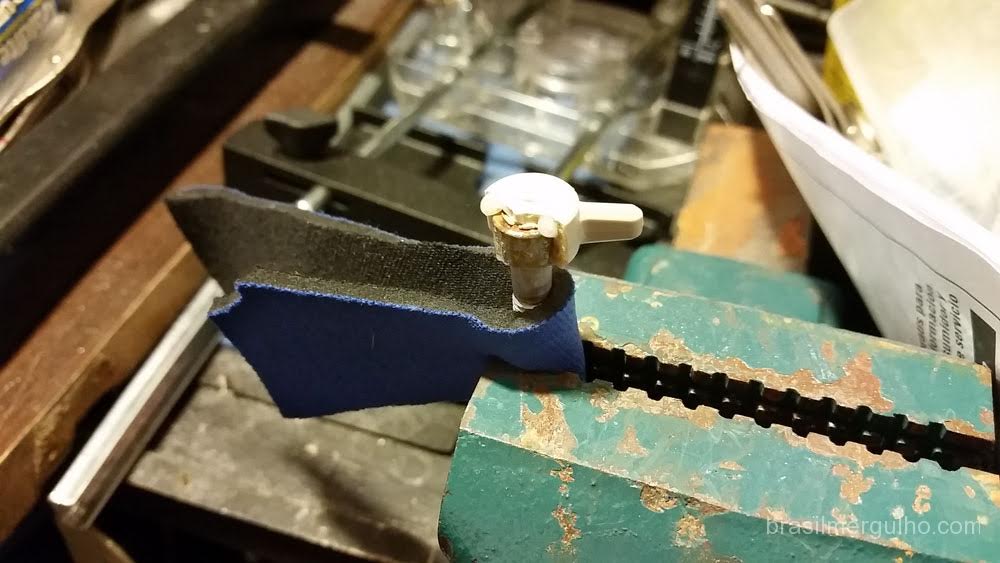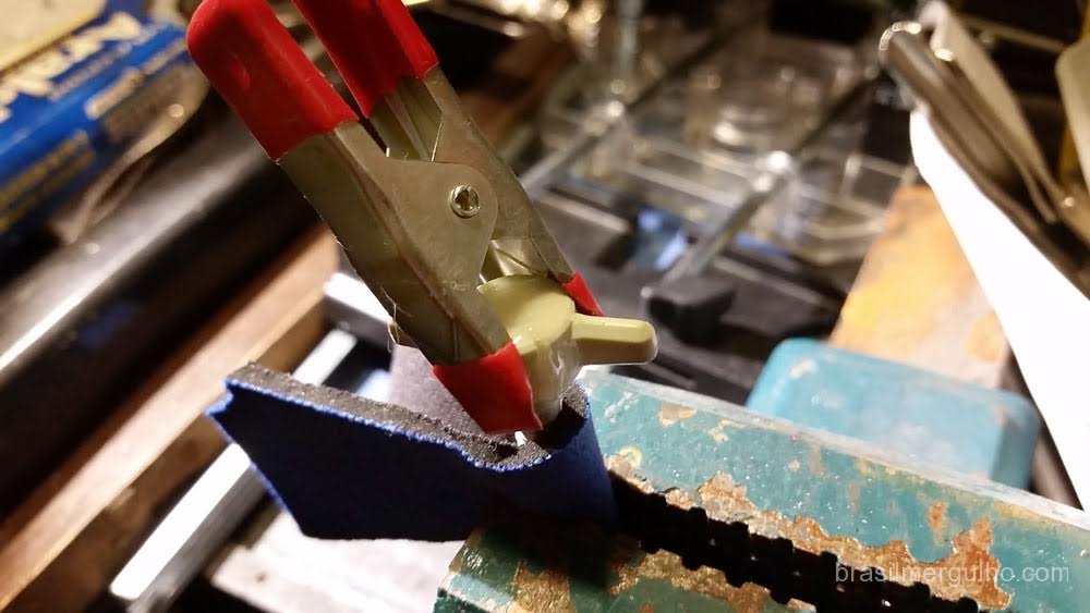 4 – Encaixe a cabeça plástica no parafuso e coloque uma pinça de fixação para que ela mantenha a peça fixa no local desejado;