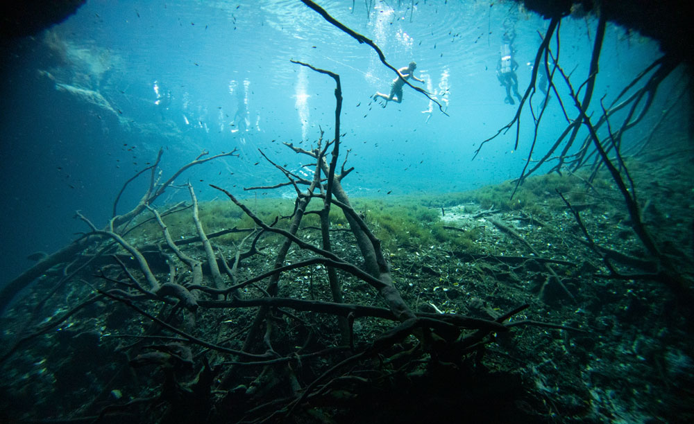 Nos primeiros quatro dias, eu e outros dois amigos, companheiros do curso de Full Cave, fizemos apenas mergulhos de turismo com um guia local, mas aproveitamos para relembrar alguns exercícios como colocação da carretilha primária. O check dive foi em Car Wash e visitamos o Salão das Lágrimas. No segundo mergulho, entramos em uma caverna à esquerda da área principal de mergulhos e passamos por restrições e zig zags que nos empolgaram já desde o primeiro dia!