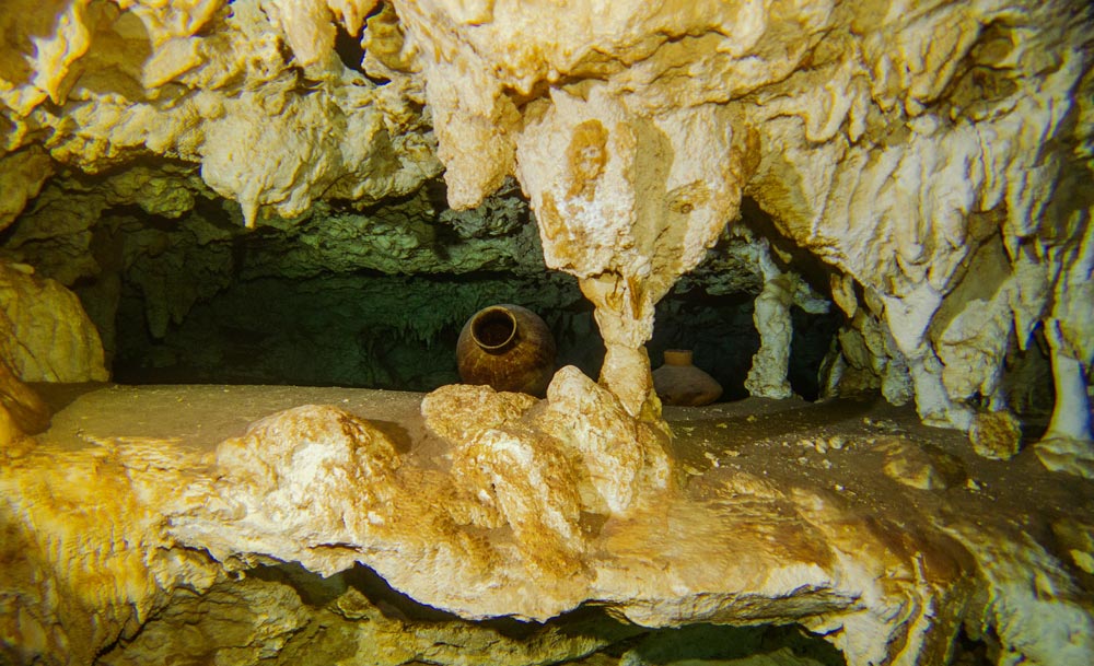 Nossos outros mergulhos de turismo foram em: Mayan Blue, onde pude lembrar como era a sensação de mergulhar em uma haloclina; Regina’s Back Door, onde mergulhei com a câmera pela primeira vez em uma caverna e pude tirar fotos das belíssimas estalactites e estalagmites; Hazuts ha, um cenote que parecia uma piscina no quintal de uma propriedade; e Chang Hol, onde vimos o crânio de um animal e vasos maias.