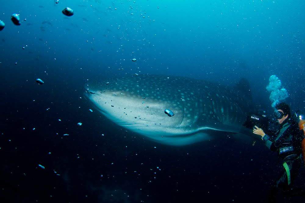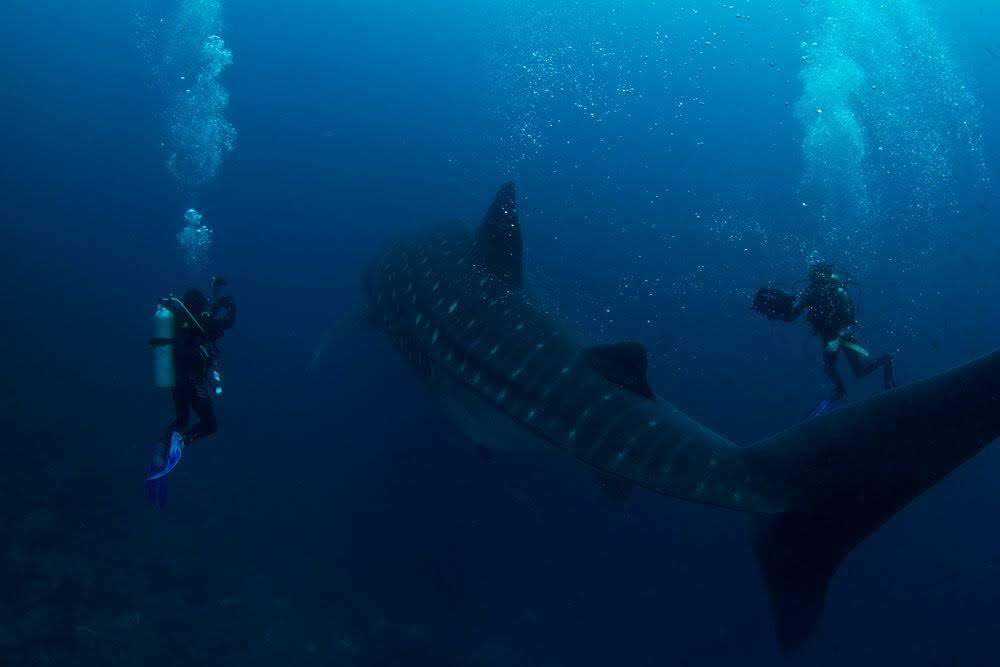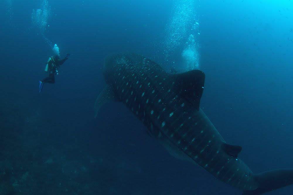 Quando o guia dava o sinal e nadava em direção ao azul e onde sequer tínhamos algum tipo de referência do fundo ou dos paredões, alguns segundos depois surgia lentamente uma grande mancha e que ia cada vez mais escurecendo até que conseguíamos perceber que o imenso tubarão-baleia vinha em nossa direção, nadando lentamente em relação ao seu tamanho, mas rapidamente em relação aos mergulhadores, pois era impossível acompanhá-lo.