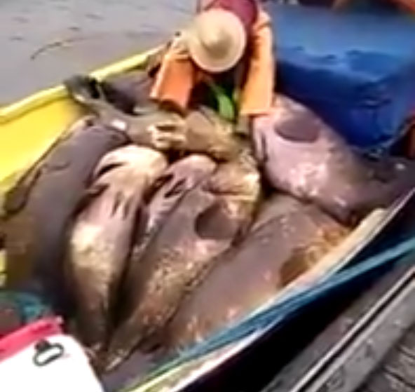 O vídeo com autor não identificado mostra um pequeno barco de pesca com dezenas de Meros que foram pescados, com um grupo de homens retirando os peixes da embarcação e nitidamente comemorando o feito.