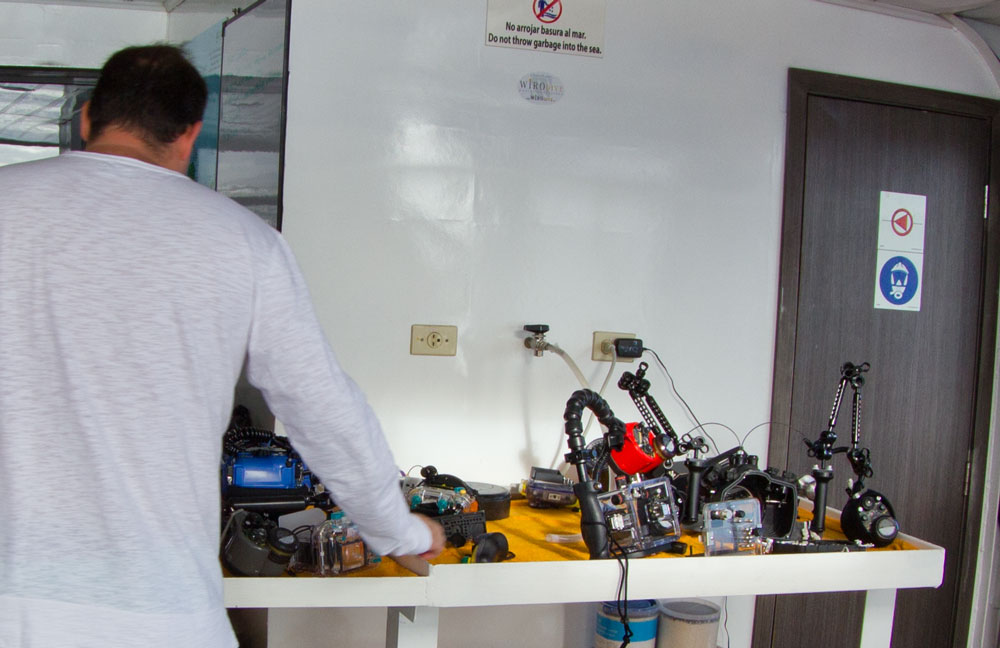 Ao sair da água, procure sempre entregar seu equipamento para um dos tripulantes, combinando previamente onde sua câmera será colocada e os cuidados com o manuseio, evitando a possibilidade de arranhões e impactos. Já tive um difusor de flash danificado durante um Liveabord, pelo descuido do divemaster da embarcação, ocasionando um prejuízo de US$ 50, fora o transtorno em conseguir comprá-lo novamente.