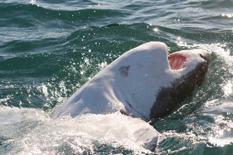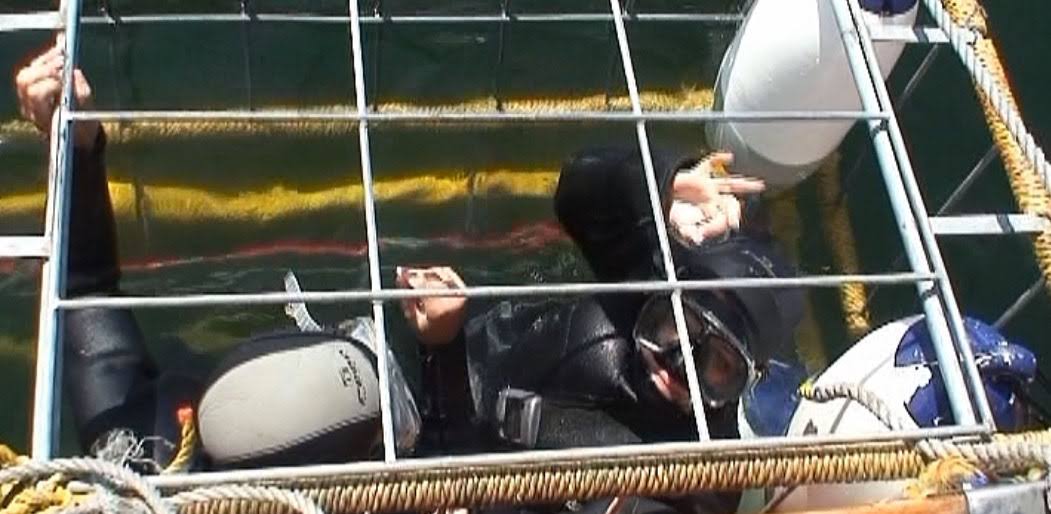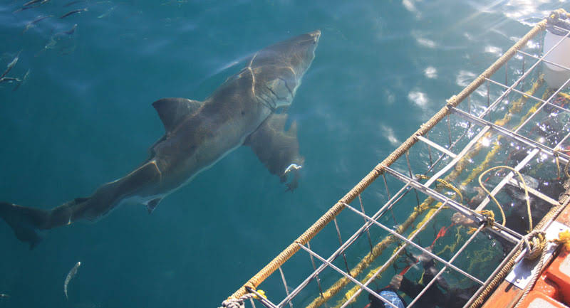 Temos que esperar um tempo razoável até avistarmos um tubarão. Assim como outros de sua espécie, estes animais também estão ameaçados de extinção e conversando com um dos estudantes que fazem parte do projeto Great White Sharks e que participam auxiliando na operação de turismo, algumas vezes em todo o percurso só conseguem avistar um único animal. Naquele dia demos sorte, pois em 30 minutos dentro da gaiola, em meio a uma água bem fria (em torno de 15°C), finalmente um dos tripulantes grita “down, down, down” e todos na gaiola afundam suas cabeças na água.