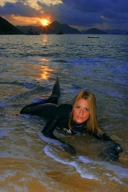 A foto da Sereia foi um ensaio fotográfico, e realmente esta foto foi o primeiro banner com divulgação que entrou aqui no Brasil. Mas, quando estamos diante de qualquer profissão, temos que agir com competência e determinação. A beleza torna-se circunstancial. Na minha profissão é muito comum o número superior de homens, mas sempre que estou em palestra ou curso, notifico as mulheres o quanto é importante para a nossa saúde recorrer ao mergulho.