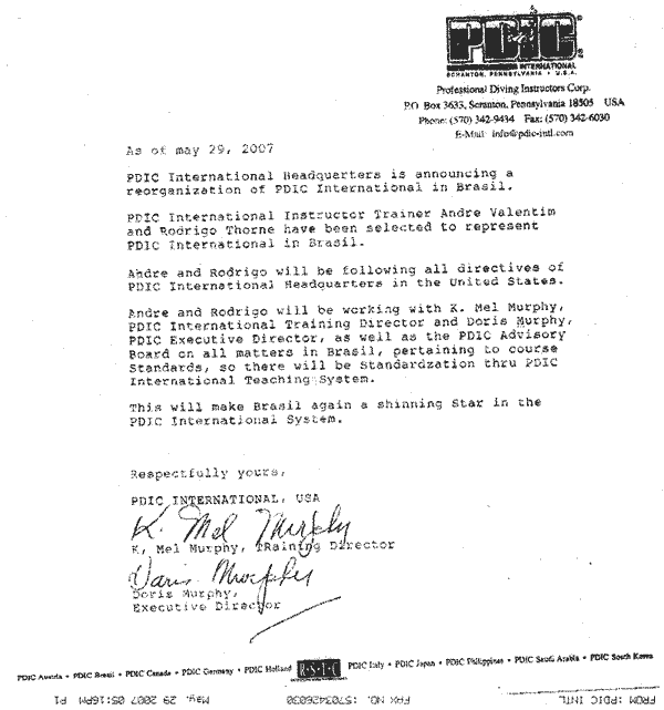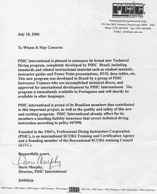 Contudo a PDIC jamais disse que a PDIC Brasil nunca existiu e que seus mergulhadores, profissionais e diretores não eram reconhecidos. Esses boatos foram divulgados de forma mal intencionada, pela internet, usando uma carta sem assinatura e de um pseudo-advogado, por setores do mercado que poderiam se beneficiar de uma possível desestabilização da PDIC. Quanto a isso, as medidas jurídicas já foram tomadas e liminares já expedidas a nosso favor. Posteriormente a justiça irá divulgar sua decisão, vamos aguardar.