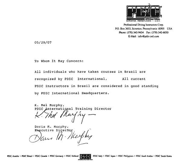 Podemos pensar… Será que se qualquer outro representante de certificadora for transferido ou retirado os certificados emitidos perdem a validade ? A PDIC-Internacional, já publicou em seu site e divulgou cartas dizendo que todos os mergulhadores e instrutores formados no Brasil são reconhecidos. Várias certificadoras presentes no Brasil mudaram seus representantes e coordenadores e pelo que me lembre, os mergulhadores certificados muitas vezes nem souberam disso.