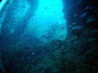 Seguindo a quilha central percorremos todo o naufrágio, agora com uma noção mais clara de onde estávamos mergulhando. Também foi possível estimar o tamanho do navio, cerca de 75m a 100m de comprimento. Pouquíssimas e breves penetrações são possíveis.