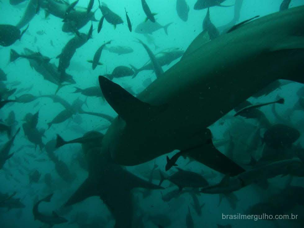 Retornamos para a água e nosso segundo mergulho. Tinha minhas esperanças pelo tubarão tigre, e agora, os tubarões foram mais rápidos para chegar. Desta vez, também haviam mais peixes e rêmoras que o mergulho anterior. Os cabeças chata parecem maiores pelo fato de haver tantos peixes no meio.