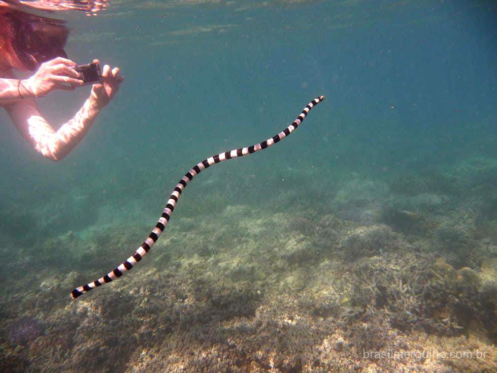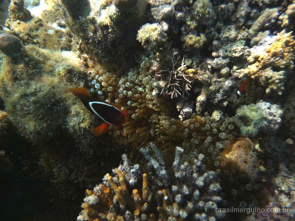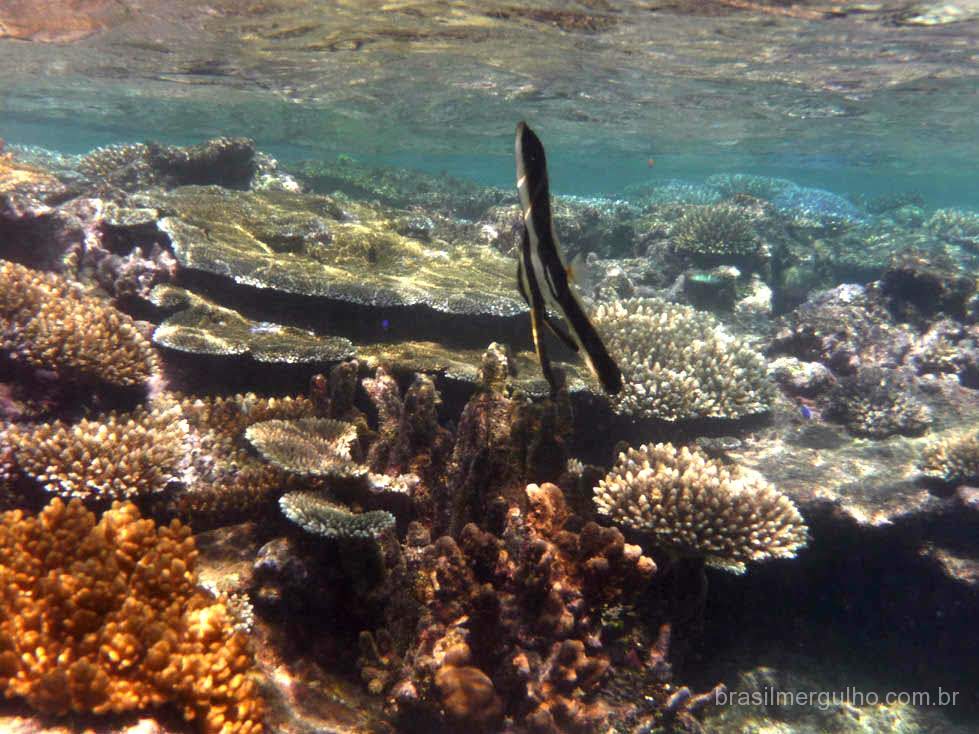 Após o almoço, tomamos ciência de um lugar onde havia um recife mais saudável e fomos até lá. O dingui nos pegou de novo e nos levou até o local. Sem dúvida era melhor, com muita vida marinha, moreias, diferente peixes e até uma cobra marinha, que curiosa chegava próximo de nós.