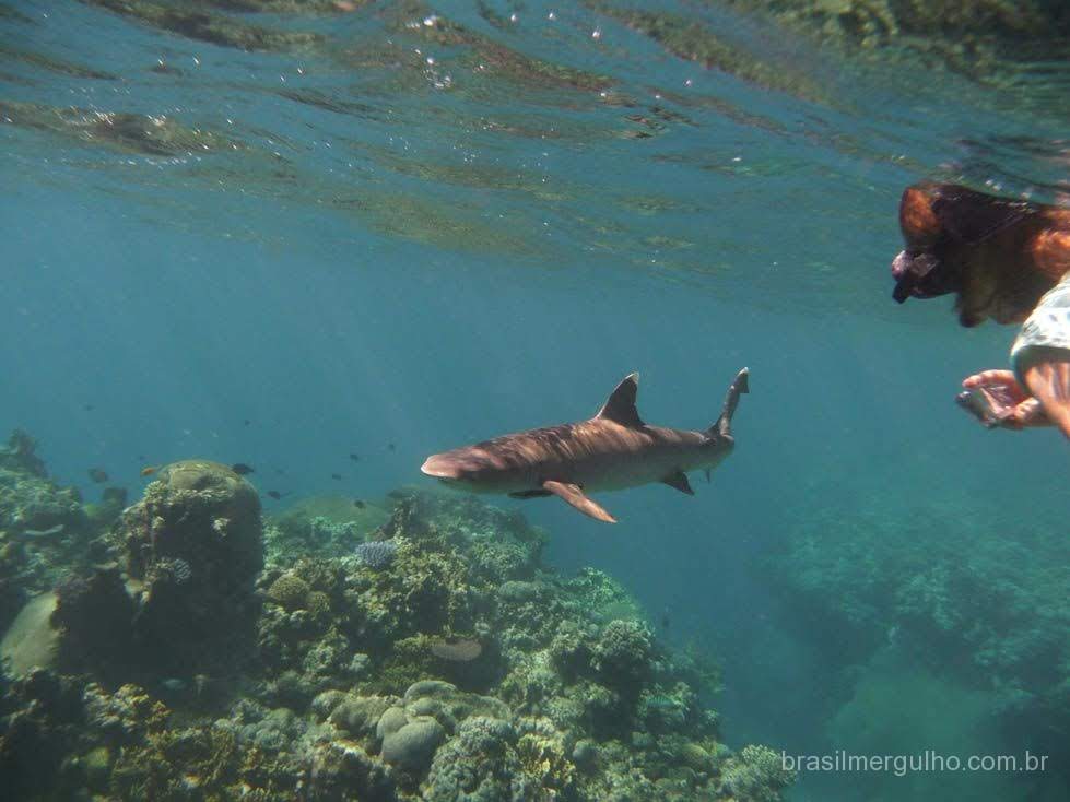 No dia seguinte tínhamos um snorkeling pra fazer, com um guia que iria conosco no dingui (barquinho de pescador agora…). Esse guia pesca alguns poucos peixes, pois os tubarões Galha Branca estão esperando. Eles eram pequenos e vinham bem próximo. O guia alimenta e os segura para mostrar aos mergulhadores.