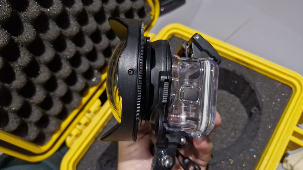 Um aspecto me chamou a atenção no que diz respeito ao preenchimento de água entre a lente do domo e a lente da caixa estanque da GoPro. Notei algumas microbolhas entre eles, sendo necessário se assegurar que todo o espaço entre as lentes seja preenchido pela água, caso contrário, uma microbolha pode impactar na qualidade da imagem obtida.