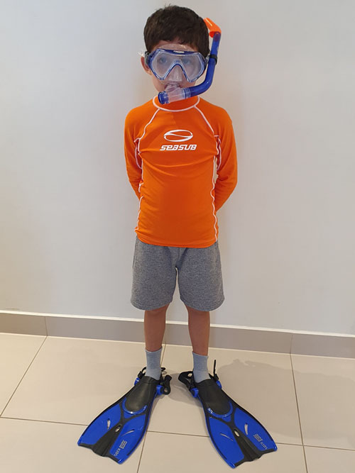 Após mais de dois anos tendo aulas de natação e, agora, com seus sete anos de idade, me senti confortável para que ele desse um segundo passo, e adquiri um kit de equipamento básico (máscara, snorkel e nadadeiras) para crianças. Aliado a isso, também uma camiseta para a proteção contra os raios solares, sendo de extrema importância, pois enquanto realizamos o snorkeling, normalmente ficamos com as costas expostas ao sol.