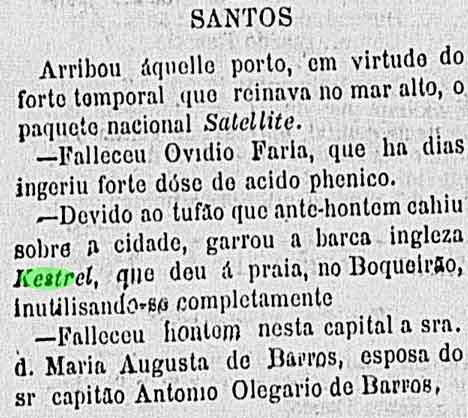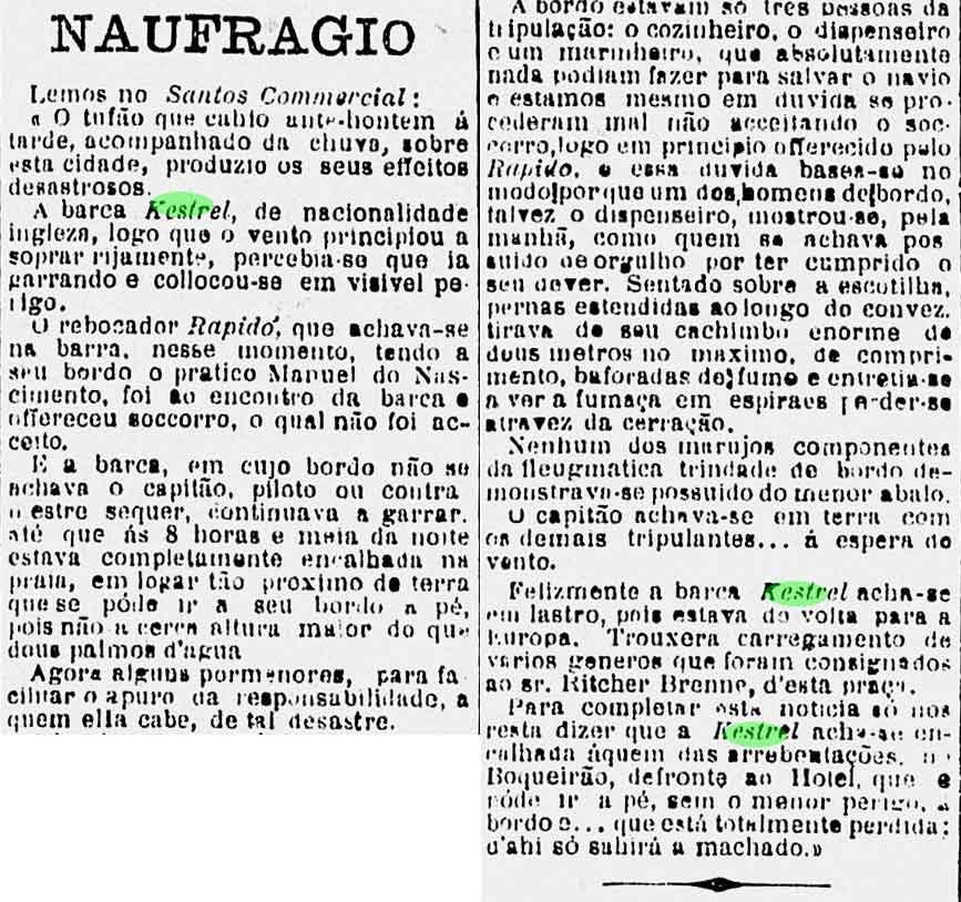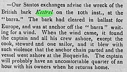 Notas: Havia saído de New York com destino ao Brasil. Encontrava-se ancorado, mas um forte temporal o jogou contra a praia, tendo o encalhe como destino final.