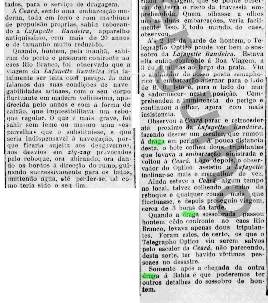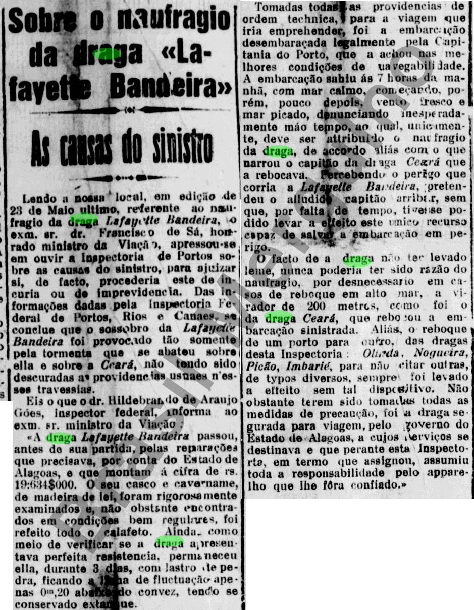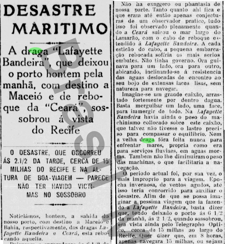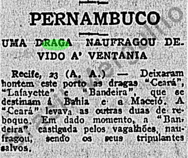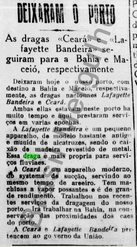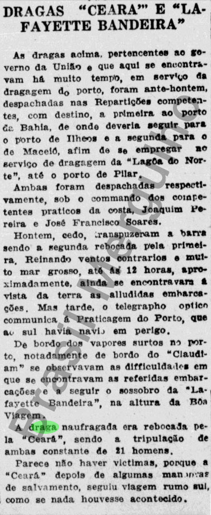 Notas: O afundamento ocorreu durante seu reboque pela draga Ceará, onde juntas, tinham como destino a cidade de Maceió – AL, para realizar um serviço de dragagem por lá.