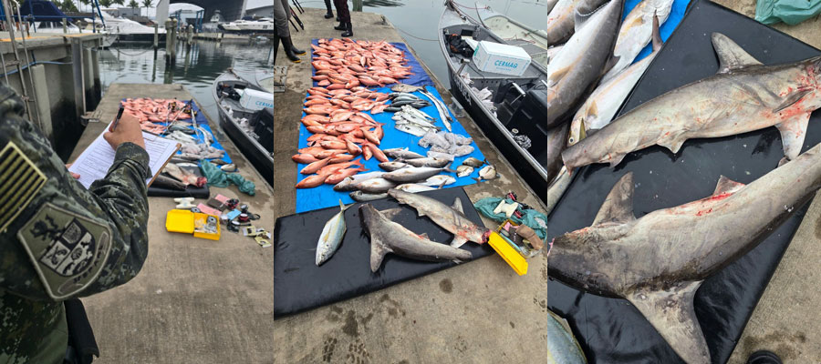 Em nota, a PM Ambiental informou que os pescadores tentaram fugir ao avistarem a lancha-patrulha, mas foram alcançados. Na embarcação utilizada por eles, foram encontrados dois tubarões-martelo e quase 170 Kg de peixes.