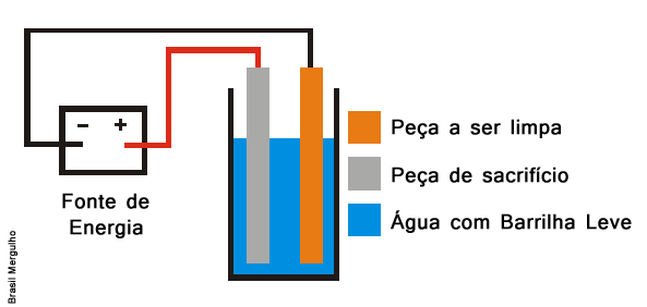 Vale ressaltar que o processo de eletrólise irá degradar o metal de sacrifício e deverá ser descartado depois da limpeza.
