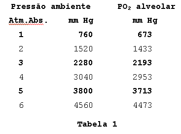 Em condições normais, a pressão parcial do oxigênio é de cerca de 150 mmHg, no ar inspirado e de 100 mmHg, no ar alveolar. A inalação de oxigênio puro à pressão atmosférica, eleva o valor do oxigênio alveolar para 673 mmHg (Tabela 1), sendo os restantes 47 mmHg de vapor d’água e 40 mmHg de gás carbônico. Na medida em que vamos aumentando a pressão ambiente, esses últimos valores não variam, sendo o aumento da pressão total feito às custas do nível tensional de oxigênio.