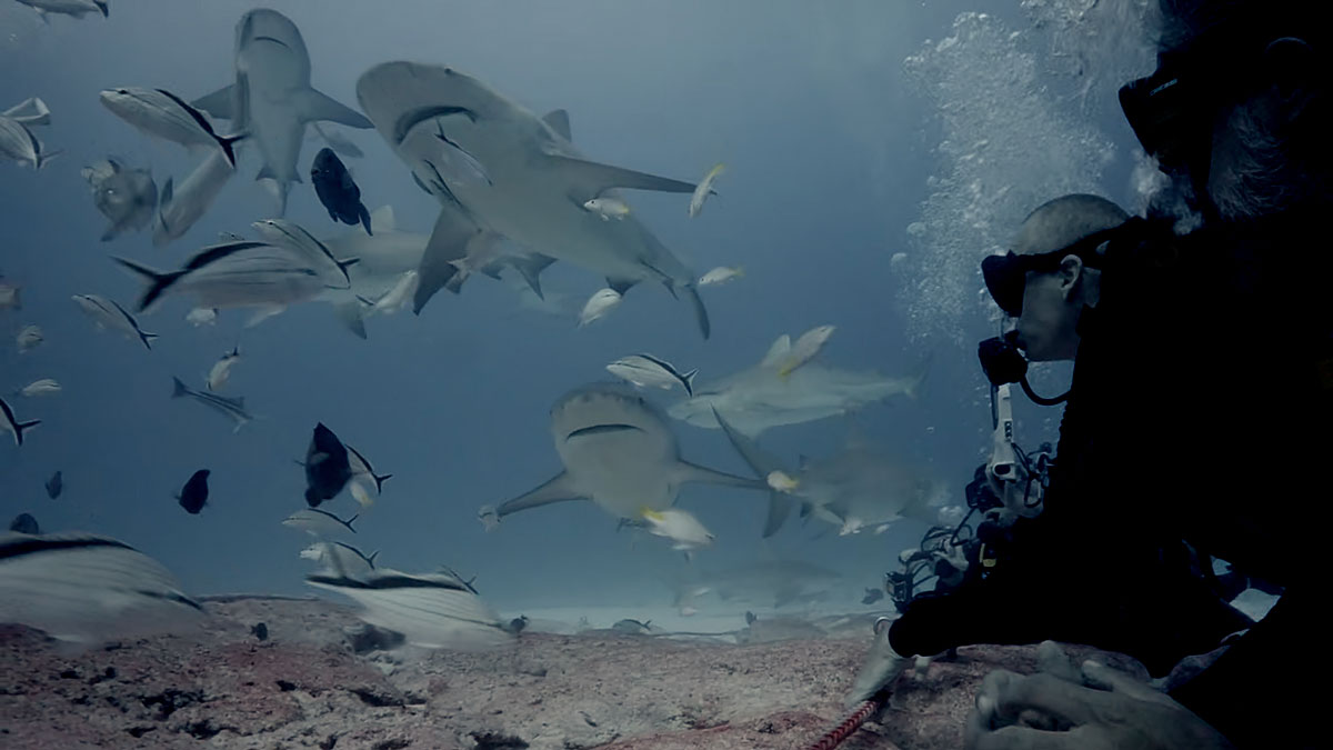 Ficamos ali deitados no fundo apreciando a alimentação dos tubarões, admirando os belos animais nadando bem próximos.