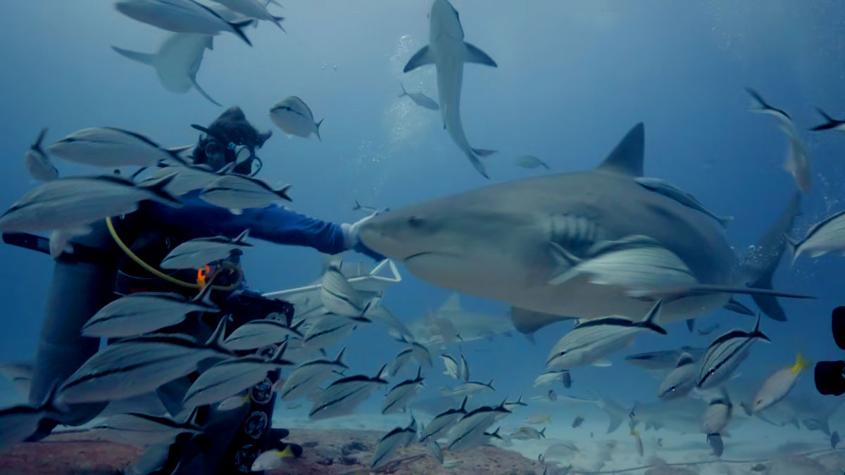 Marco desceu com a caixa de peixes utilizando uma roupa específica de metal para esse tipo de atividade e mantendo sempre uma distância dos mergulhadores, e isso faz com que os tubarões fiquem mais próximos dele e distante dos clientes mergulhadores.