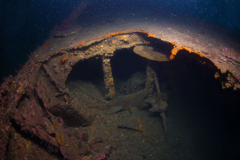 Uma boa parte da carga da madeira ainda se encontra no local. É possível avistar o leme e o hélice do navio, facilitada pela posição em navegação no fundo lodoso.