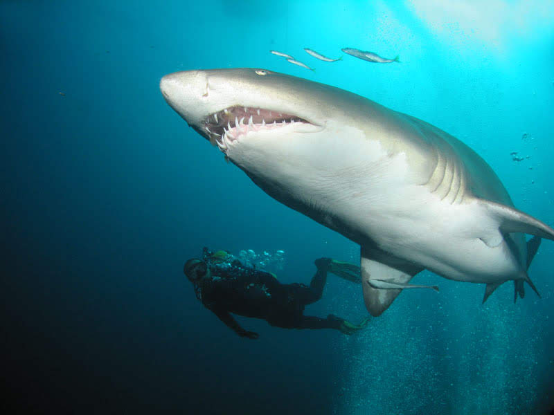 E para completar, o local era repleto de Tubarões Mangona (Carcharias Taurus) – grandes, com cara de mau e completamente inofensivos.