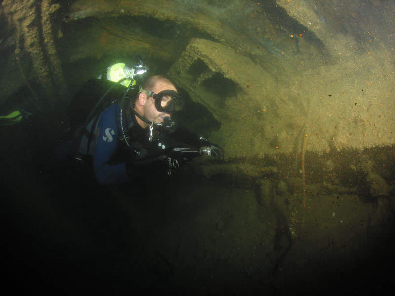 Seguindo em direção à proa, existe uma abertura retangular com nítidas marcas de penetração. No briefing de mergulho, não recebemos nenhuma instrução que proibisse a penetração e, como somos treinados para tal, decidimos cautelosamente e respeitosamente entrar no U-352. O mergulho ficou ainda mais fascinante…
