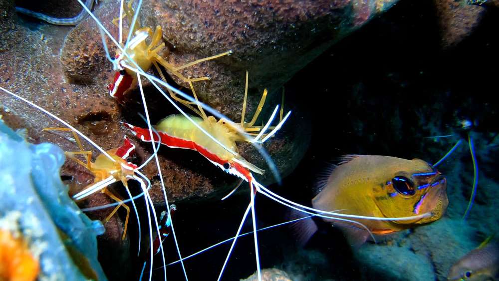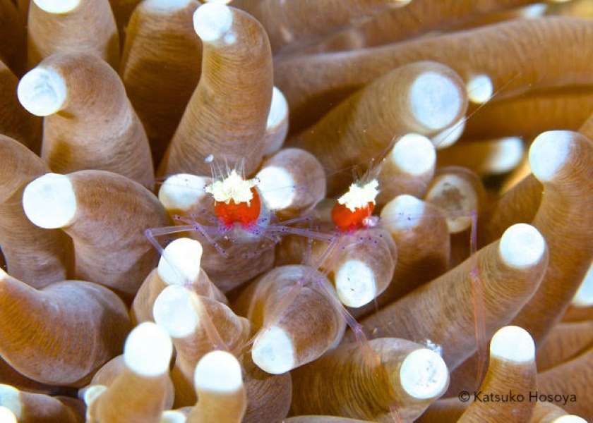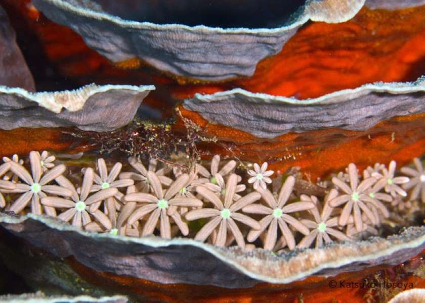 Existem inúmeros Mushroom Corals neste ponto de mergulho e se olhar bem de perto, sempre vai achar esses camarões de Mushroom Coral vivendo neles.