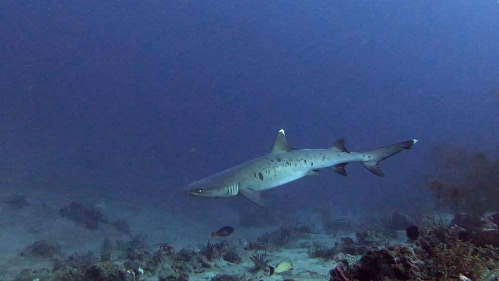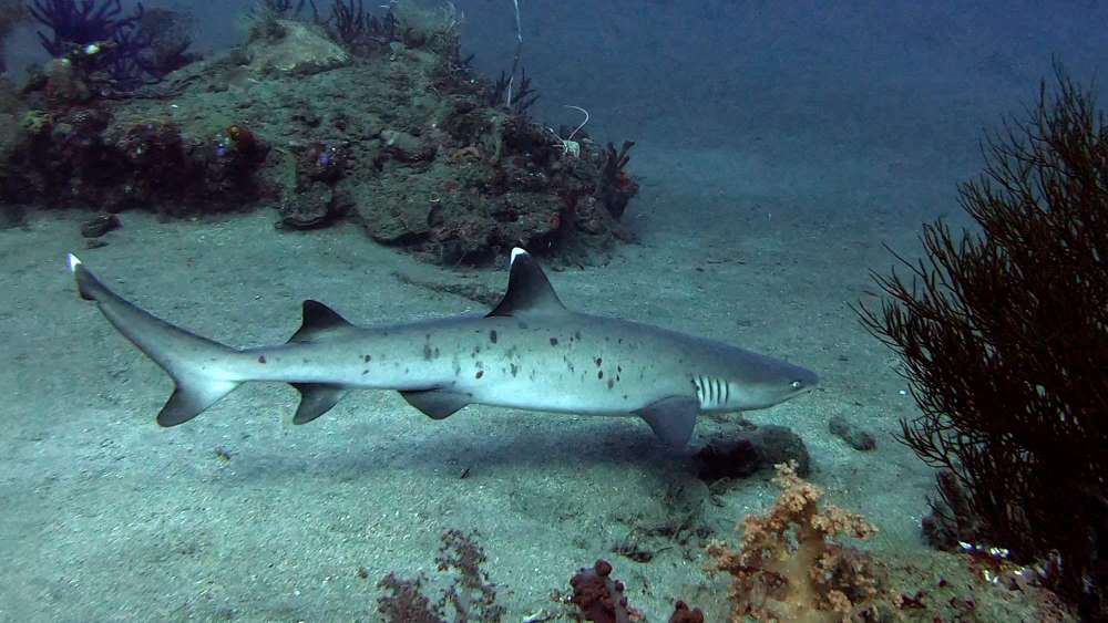 O recife segue com uma inclinação acentuada coberta de corais, sendo um habitat de nudibrânquios e camarões. Se for um pouco mais fundo, por volta de 22m no fundo de areia, vai encontrar alguns tubarões-galha-branco residindo no local. Claro que fui mais fundo para vê-los de perto e um deles era muito curioso, se aproximando de mim várias vezes. Talvez tenha me reconhecido !