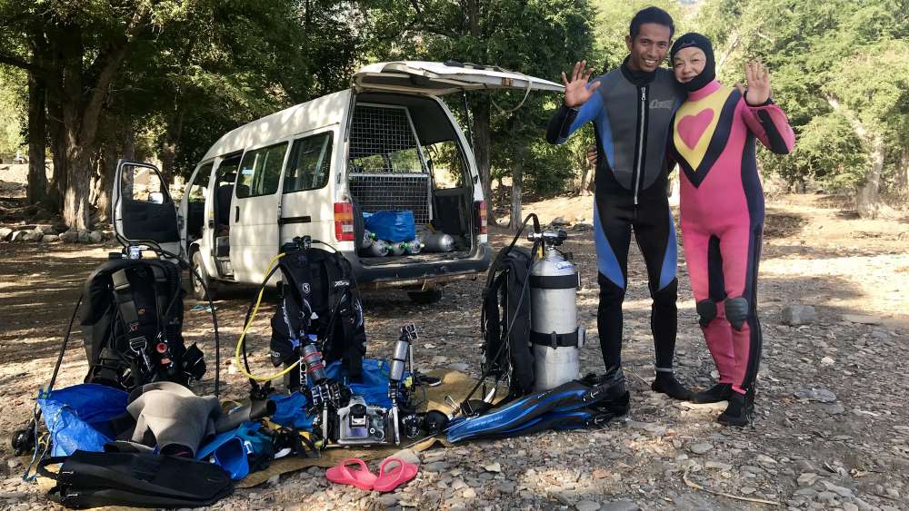 O pessoal do centro de mergulho Dive Timor Lorosae foram ótimos organizando nossa agenda e nos ajudando nos mergulhos. A Katsuko possui uma câmera subaquática enorme e já passou por duas cirurgias de prótese de quadril, o que faz com que mergulhos da praia sejam difíceis para nós, mas ao contrário do esperado, tivemos toda a ajuda da equipe e dos guias de mergulho, e tudo ficou extremamente fácil.