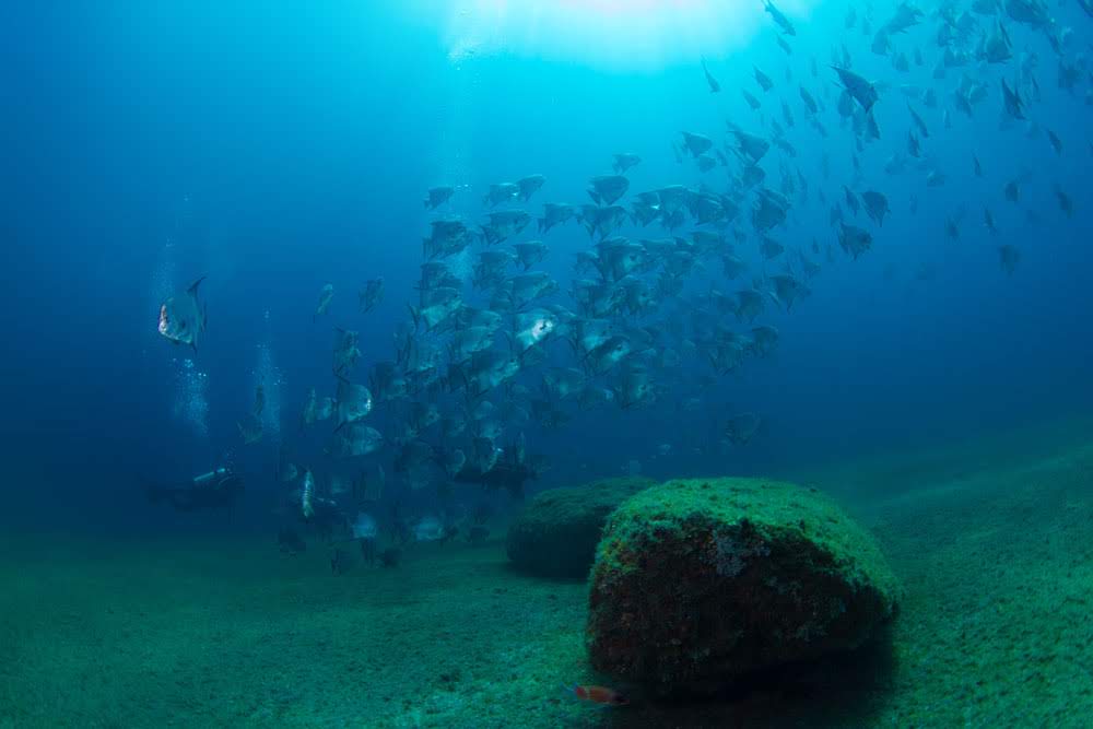 Realizamos ótimos mergulhos, sendo acompanhados muitas vezes pelos enormes cardumes de enxadas, que sempre estão por lá para dar as boas vindas aos mergulhadores com seu show de brilho.