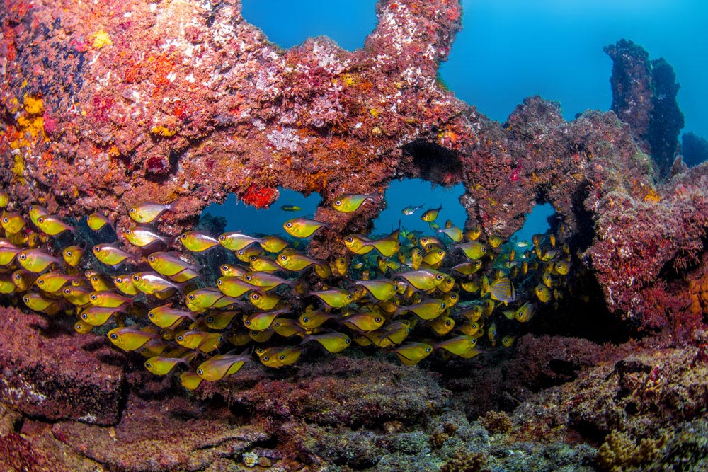 Vale muito a pena o uso de uma boa lanterna neste mergulho, pois ela permitirá visualizar as áreas de sombra pelo que sobrou desses naufrágios.