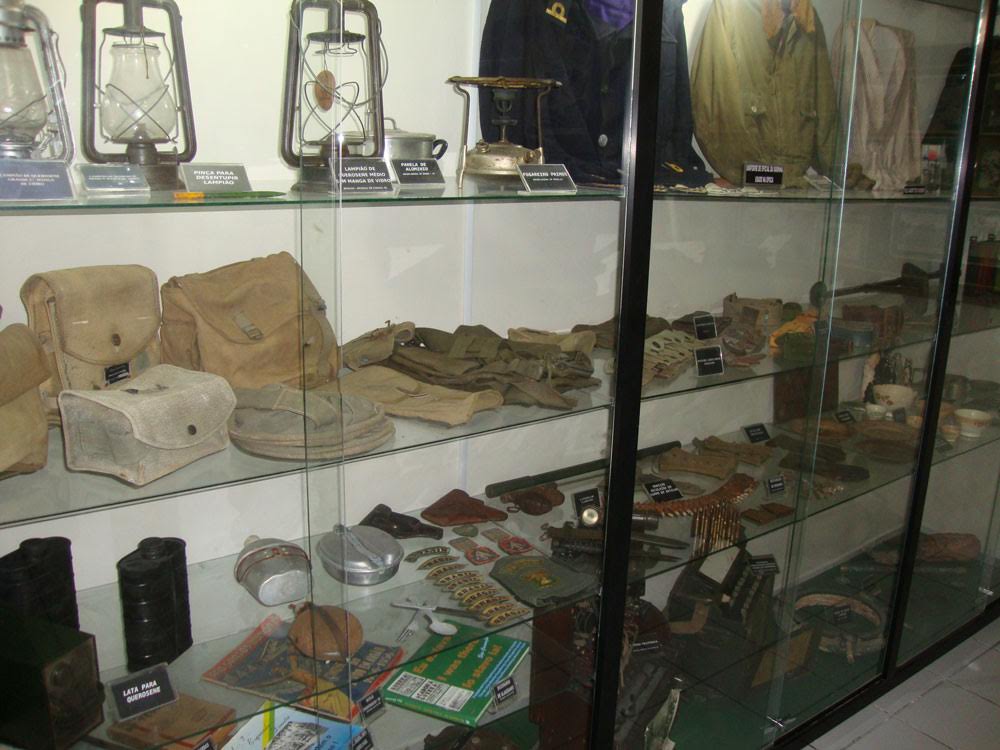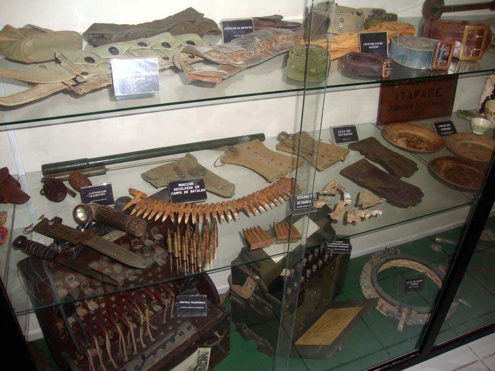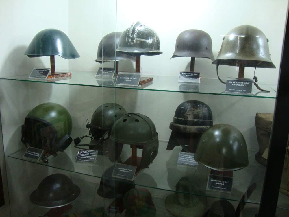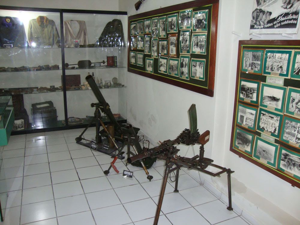 Também nas paredes estão muitas fotos, mapas e documentos. No expositor dos capacetes de aço, havia algumas etiquetas de identificação trocadas, detalhe alertado por mim ao sargento que me acompanhava. Em outra vitrine estava uma icônica submetralhadora alemã MP 40, sonho de muitos colecionadores. Espalhados pelas salas, também podiam ser apreciados metralhadoras Madsen, Browning, morteiros, minas terrestres, detectores e uma bazuca.