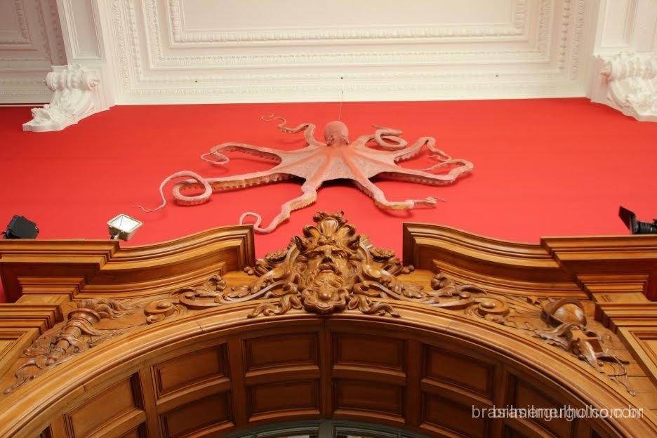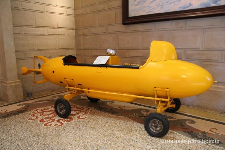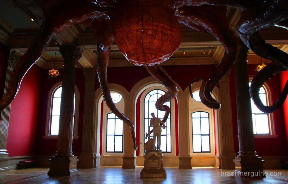 Ainda do lado de fora, o ingresso é comprado, e entramos pela porta principal do museu, alcançando de cara, uma enorme sala com um imenso polvo fixado ao teto, com a estátua do fundador do museu nas proximidades. Do lado de fora e logo na entrada do museu, encontramos alguns dos mini submarinos fabricados por Cousteau para suas aventuras, o que me fez lembrar, dos antigos documentários que vi quando era criança.