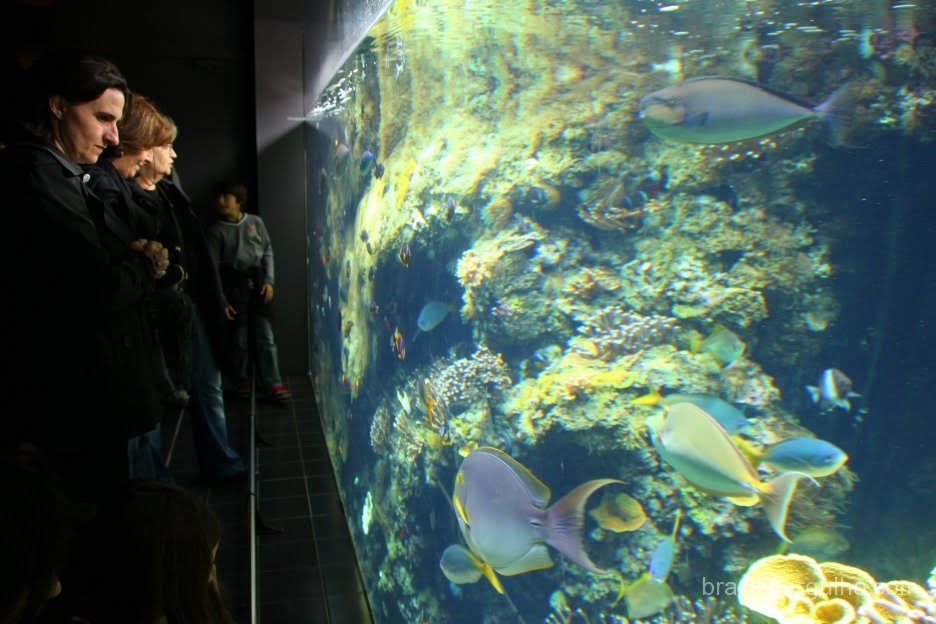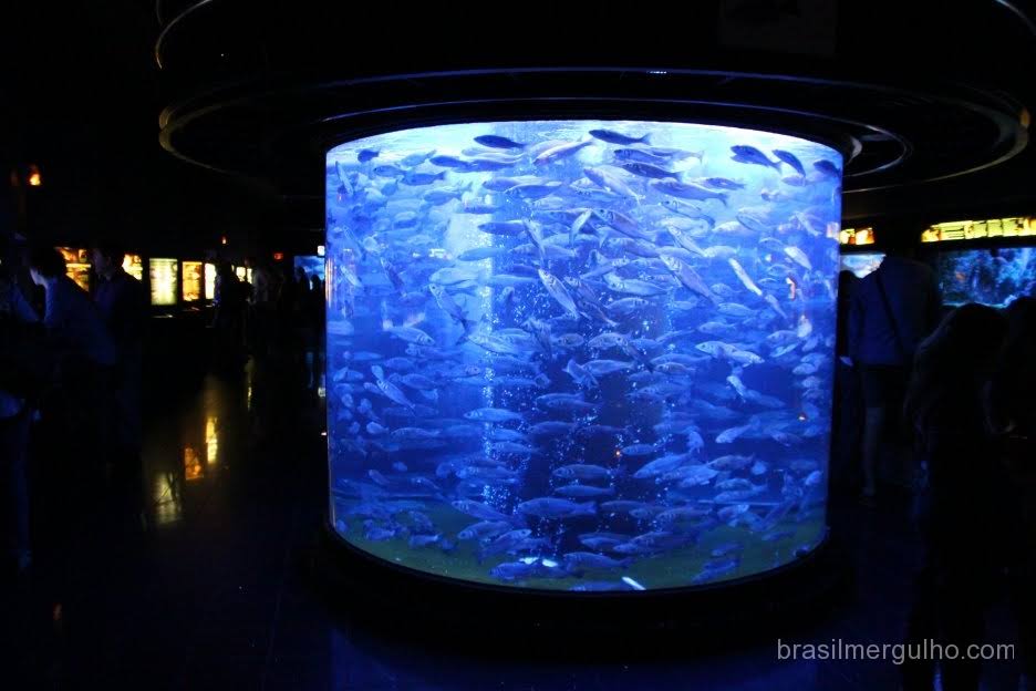 Após um longo tempo olhando a parte térreo e superior do museu, fui em direção ao subsolo conhecer os aquários, que até então, achava que não seriam muito grandes, pois o antigo site do museu, passava essa impressão. Ao chegar no ambiente, fiquei surpreso com o tamanho do aquário maior, e com a quantidade de aquários marinhos.