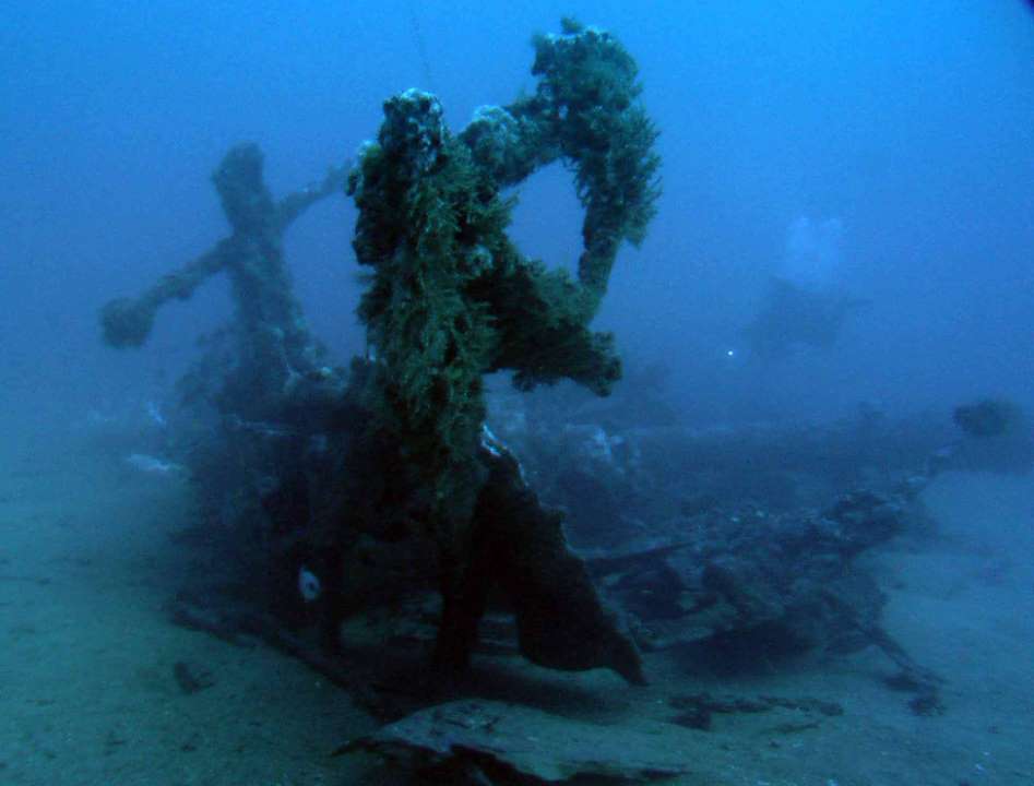 Notas: Foram encontradas 3 âncoras almirantado, um guincho, 1 pau de carga, cabeços de amarração, motor à diesel, hélice, leme, máquina do leme e muita chaparia.