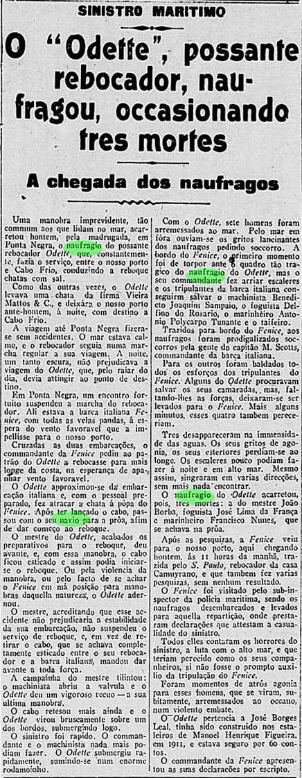 Notas: O comandante resolveu ajudar uma embarcação que se encontrava parada devido a calmaria. Foi amarrado um cabo entre as embarcações, mas quando o rebocador deu força nas máquinas, em um segundo momento, ele acabou emborcando e naufragou.